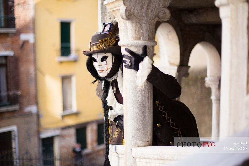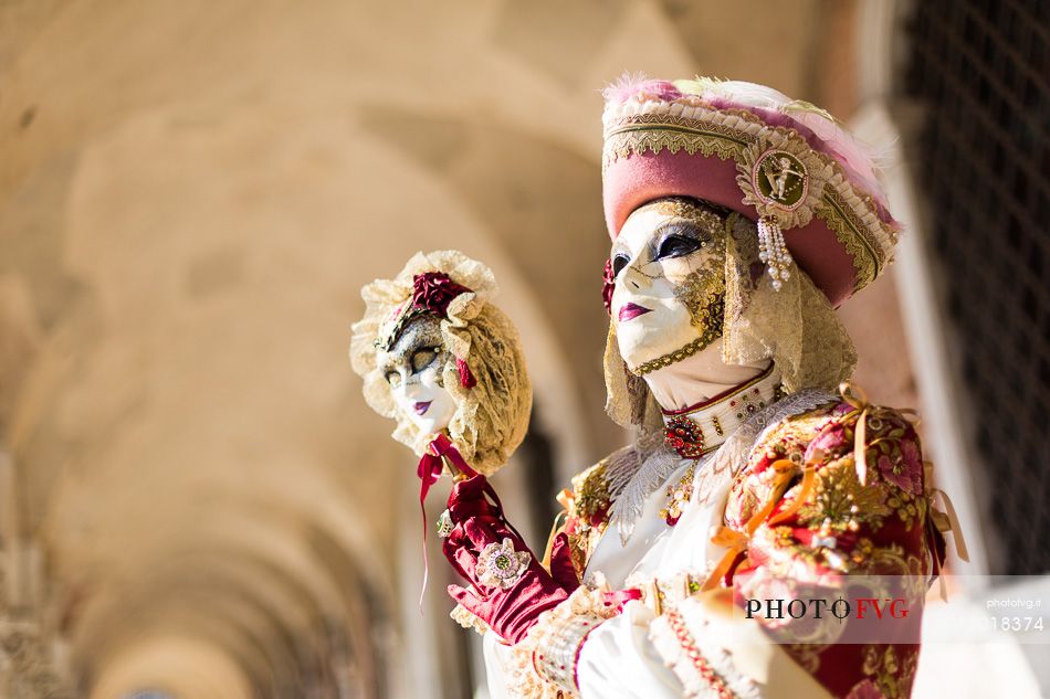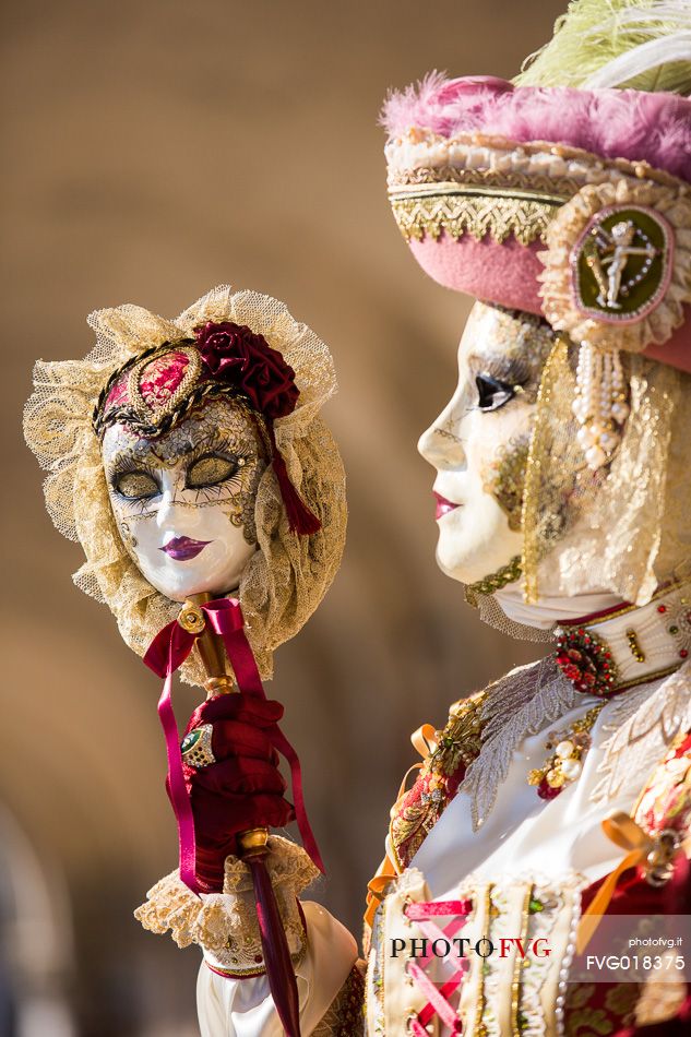 A pair of carnival masks under the loggia of the Doge's palace in Venice.Italy