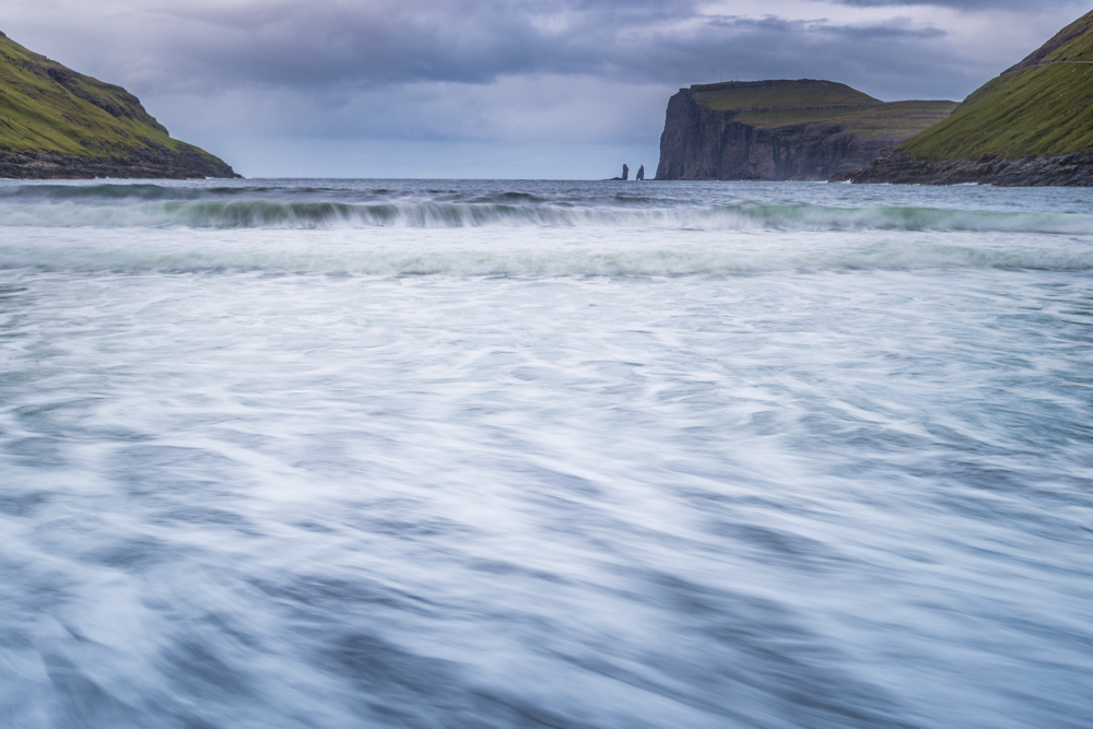 Wild sea and in the background the sea stacks of Risin and Kellingin, just off the northern coast of the island of Eysturoy from Tjornuvik village, Streymoy island, Faeroe islands, Denmark, Europe