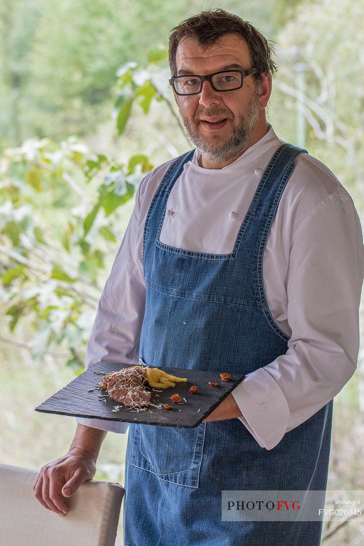 Ristorante Skay: piatto tipico misto con casunziei di patate e speck, canederli, tagliatelle con ragù di cervo e cestini dolci di crema pasticcera e fragole fresche, Cadore, Veneto